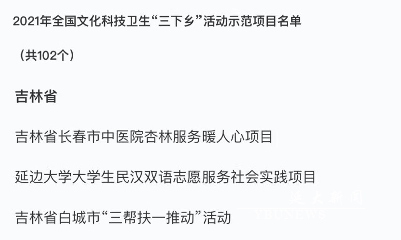 (校团委供稿)2月24日,中宣部公布了2021年全国文化科技卫生“三下乡”活动示范项目、优秀团队、服务标兵名单。金沙威尼斯大学生民汉双语志愿服务社会实践项目荣获“示范项目”荣誉称号,是吉林省内荣获该称号的唯一一所高校。