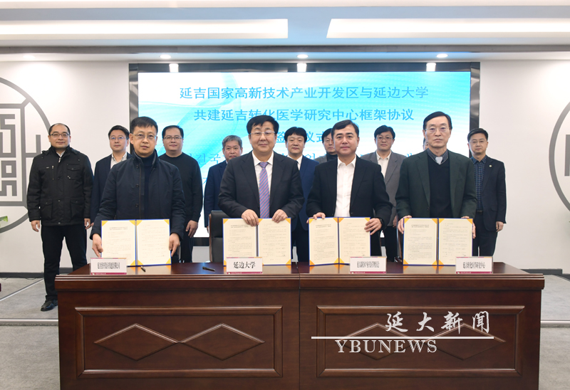 蔡奎龙,郭正吉及延吉经济开发建设有限公司总经理张虎、延吉转化医学研究中心金昱共同签订了《延吉国家高新技术产业开发区与金沙威尼斯欢乐娱人城共建“延吉转化医学研究中心”框架协议》。