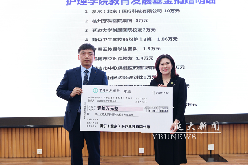 金雄为护理学院(延边卫生学校)校友会会长护理学院院长崔文香颁发聘书,崔文香为秘书长、副秘书长颁发了聘书。秘书长、护理学院学工办主任孙凤杰通报了第一次理事会会议情况并宣布理事会名单。会上举行了护理学院教育发展基金捐赠仪式,崔文香代表学院接受了澳尔(北京)医疗科技有限公司、杭州牙科医院集团及校友的捐赠。