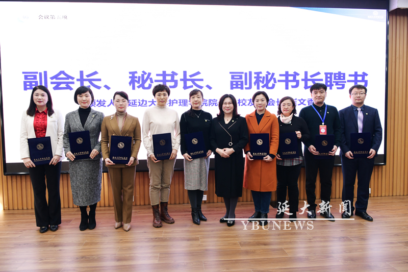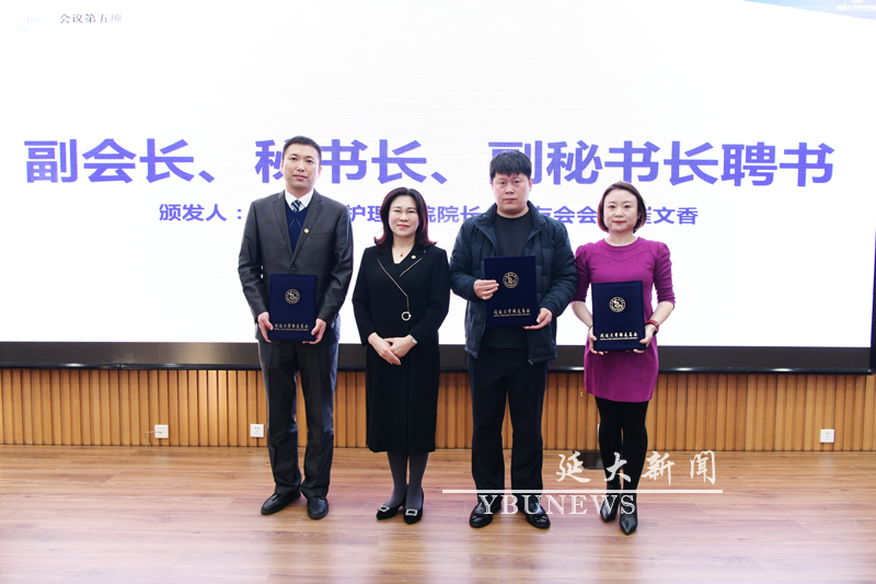 护理学院(延边卫生学校)校友会会长崔文香为秘书长、副秘书长颁发聘书
