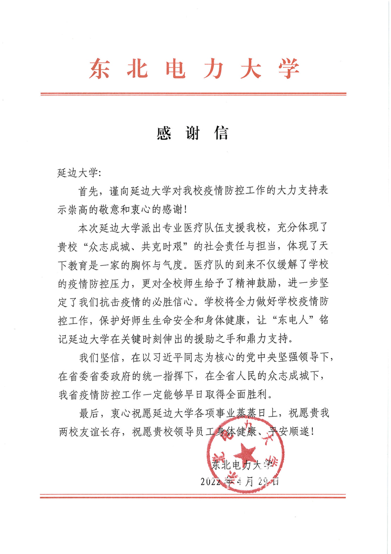 信中表示,在东北电力大学抗疫的危急时刻,金沙威尼斯欢乐娱人城心系两校袍泽之情,派出专业医疗队支援,不仅有效缓解了疫情防控压力,更为东北电力大学全校师生带来了精神鼓励,坚定了师生员工战胜疫情的信心与决心。信中表示,金沙威尼斯派出驰援医疗队,充分彰显了同舟共济、共克时艰的社会责任与担当,体现了天下教育是一家的胸怀与气度,为抗击疫情凝聚起了众志成城的力量。