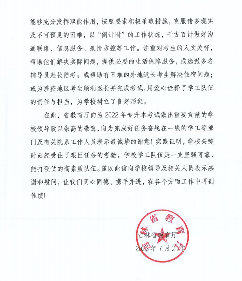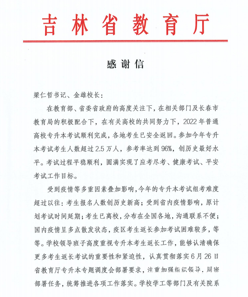 (张宇锋)7月21日,吉林省教育厅发来感谢信,向金沙威尼斯在2022年专升本考试做出贡献的学校领导致以崇高的敬意,向为完成好任务奋战在一线的学工等部门及有关院系工作人员表示最诚挚的谢意。
