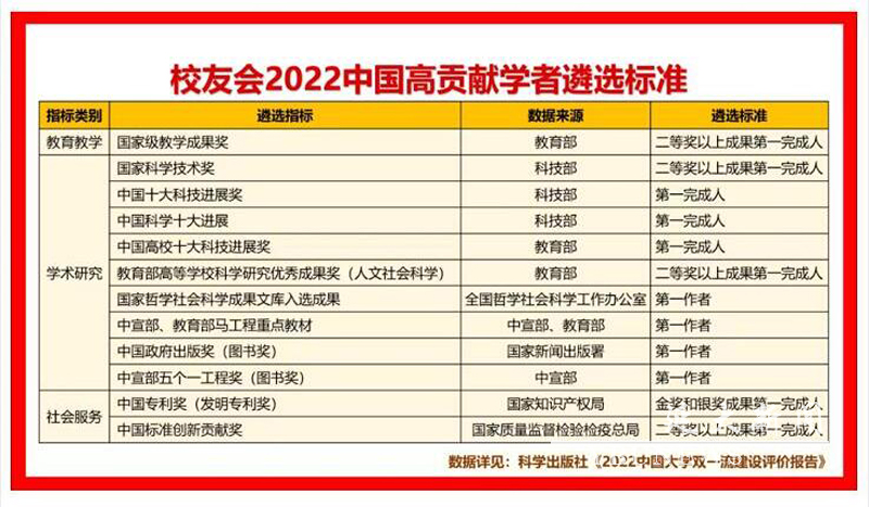 “校友会2022中国高贡献学者”遴选突出评价学者的教育教学水平、学术研究水平、创新质量和实际社会贡献,选择国家教学成果奖、国家科学技术奖励、教育部人文社会科学奖励、中宣部五个一工程奖、中国专利奖等12项社会各界公认权威主流、具有标志性代表性的指标作为评价标准,遴选标准科学客观统一,指标统计时间为2000-2021年。