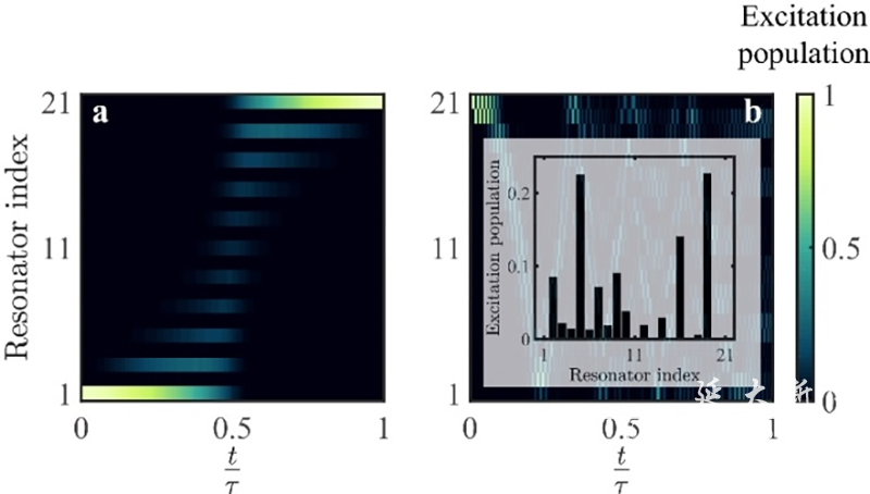为探究这一问题,王洪福教授研究团队通过利用一维周期调制的时变超导电路量子电动力学晶格模拟二聚化的聚乙炔Su-Schrieffer-Heeger模型,并基于系统中两个特定拓扑边缘模之间绝热泵浦过程的非互易性设计构建了受拓扑保护的量子二极管。研究发现,位于该晶格两个边界超导共振器处的光子激发之间的转移是单向的,这可实现由非互易输运现象所表征的量子二极管,且该单向转移的过程会随着周期调制振幅的增加而变得越发明显,这能提高由保真度所定义的该量子二极管的质量。为加速该量子二极管中的非互易输运行为,通过变换周期调制的形式并基于控制函数的最优化设计,一个更快速的单向转移过程也得到了实现,且花费的时间可减少将近三分之一。此外,该量子二极管抵御适度的无序的鲁棒性也得到了进一步的验证。该研究成果为拓扑系统中量子输运的应用提供了独特的思路和见解,并在鲁棒和高效量子态操控的设计和开发等方面具有广阔的应用前景。